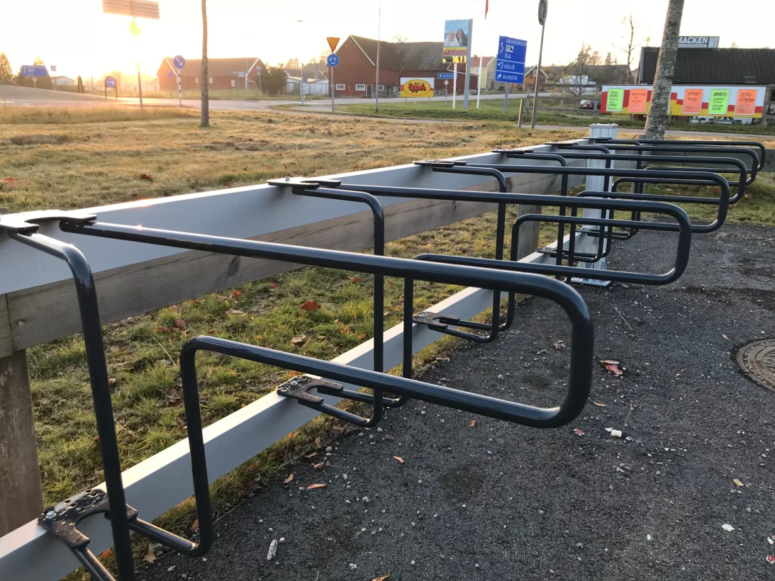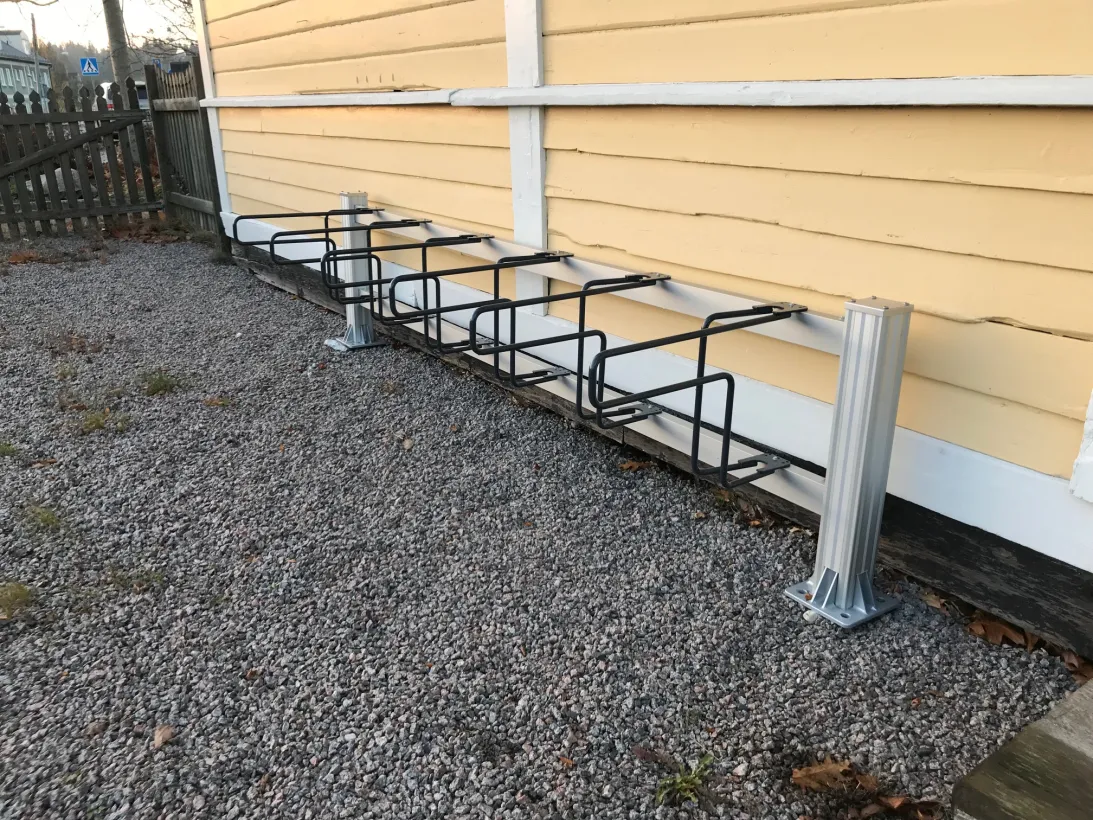 Cykelställ med stöd för framhjulet samt ramlåsning. Tillverkade av underhållsfria naturanodiserade aluminiumprofiler