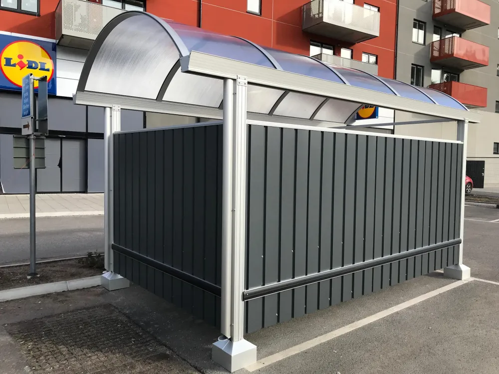 Kundvagnsgarage tillverkade av underhållsfria naturanodiserade aluminiumprofiler.