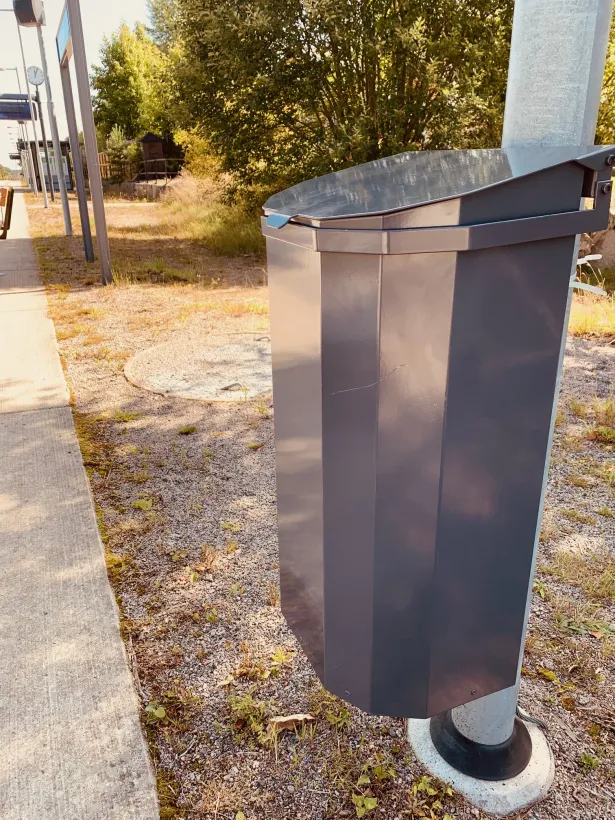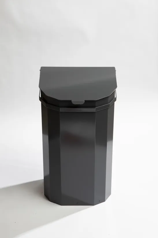 Tiltbar papperskorg med robust design av pulverlackerad galvaniserad stål med lock som är upphängningsbar på tex stolpe.